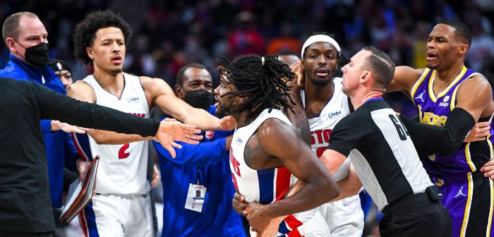 24直播网11月23日讯,在昨日湖人与活塞的常规赛中,詹姆斯因在争取篮板卡位中肘击活塞球员斯图尔特被判二级恶意犯规驱逐。
