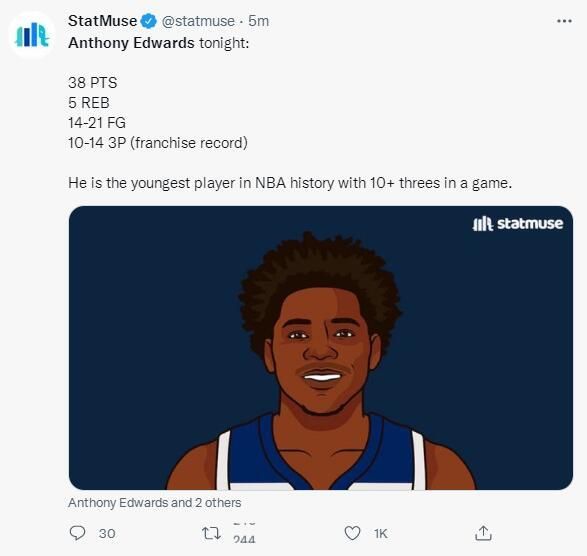这场比赛爱德华兹还创造多项纪录,他拿下27分时生涯总得分就突破2000大关,成为森林狼队史最年轻的2000分先生。