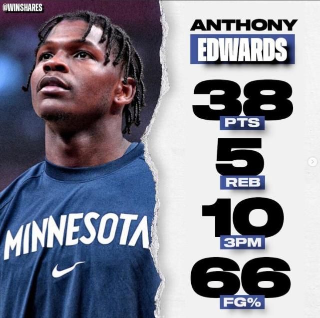38分也是全场最高分,10个三分也是全场最多,森林狼全队命中23个三分球,掘金全队命中14个三分球,他一人的三分球是占了掘金70%以上,掘金如何能不吞下大败?爱德华兹这位2020年的状元的确有些天赋啊。