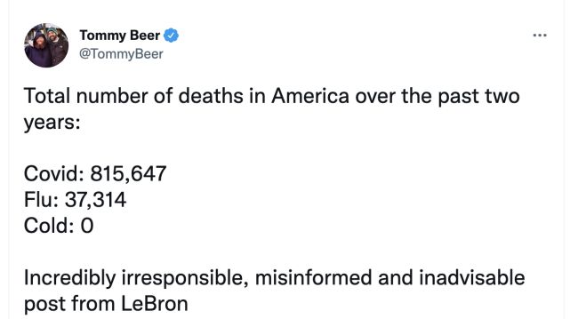 考虑到近段时间联盟疫情的严重程度,这样的言论也引起球迷和一些名人的不满。著名主持人汤米-比尔直接列出数据反驳詹姆斯的言论: