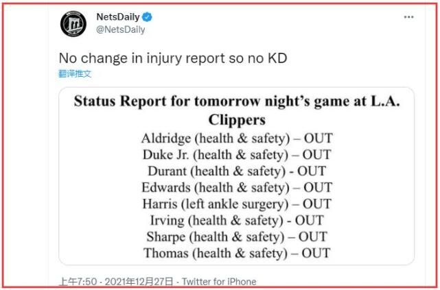 除了乔哈里斯正在养伤之外,其他7人全部因为触发健康安全协议,而原本外界预计杜兰特在错过与湖人的圣诞大战之后,将会在对阵洛城另一个对手快船的比赛中迎来复出,但从目前来看,杜兰特的复出时间还将会进一步延迟。