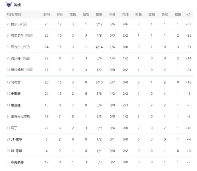 黄蜂:三球17分3篮板,迈尔斯-布里奇斯10分3篮板3助攻,乌布雷15分,伊斯-史密斯13分8助攻