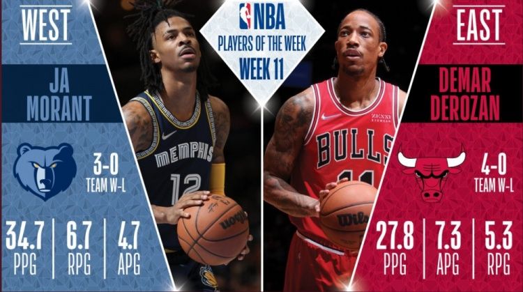 24直播网1月4日讯,NBA官方公布NBA第11周NBA东西部周最佳球员,灰熊后卫莫兰特和公牛球星德马尔-德罗赞分别当选。莫兰特在上周带领灰熊取得3胜0负的战绩,场均可以得到34.7分6.7篮板4.7助攻。