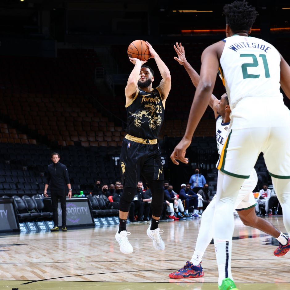 然而在猛龙众将的努力下,第二节爵士只拿到了22分,他们成功的守住了第二节爵士的攻势,但这并不值得高兴,他们还落后着两位数的分差,然而到了第三节,形式转变,沉寂了两节时间的范弗利特直接开启“范乔丹”模式,单节8中8砍下24分打爆了爵士队,带领猛龙用一波夸张的单节45分逆转比赛。