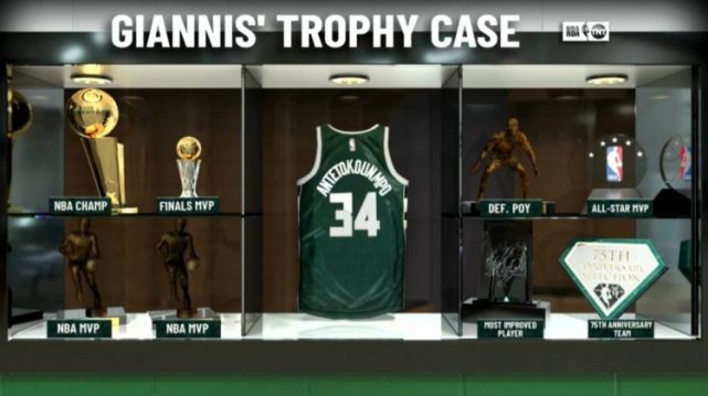 雄鹿领先32分时,TNT直播展示字母哥奖杯柜