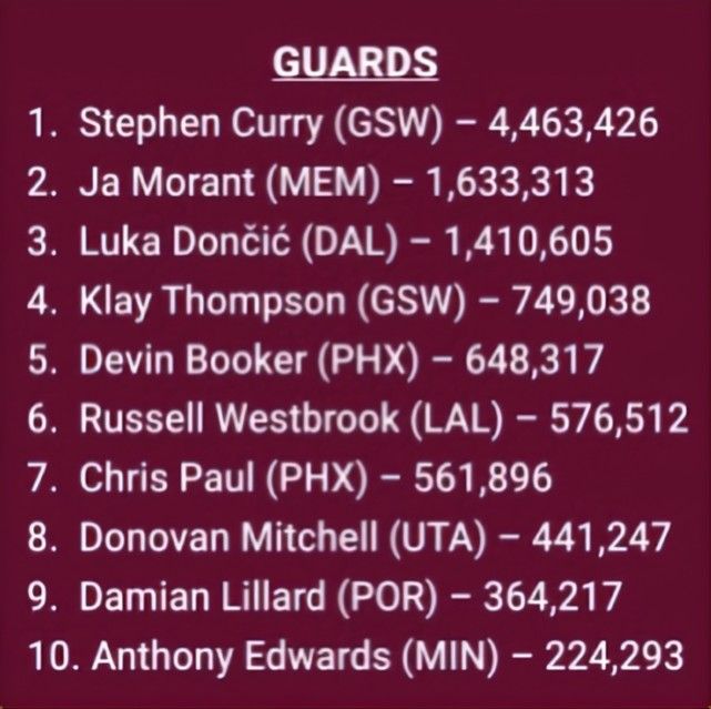 东契奇和莫兰特还是西部后场全明星首发席位的竞争者。莫兰特目前以1633313票在球迷票选排名西部后场第二,东契奇1410605票排名西部后场第三。灰熊战绩也好于独行侠,这会给莫兰特在媒体和球员票选中加分。不过这场比赛,东契奇压制莫兰特,则会让他加分不少。两人竞争全明星后场首发席位很激烈。至于另外一个首发席位肯定属于库里。