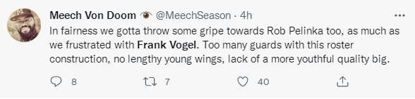 “平心而论,尽管我们对沃格尔的排兵布阵感到沮丧,但也该对佩林卡发些牢骚,球队名单上多数都是后卫,没有年轻的侧翼,缺少一个更有青春气息的大个子。”
