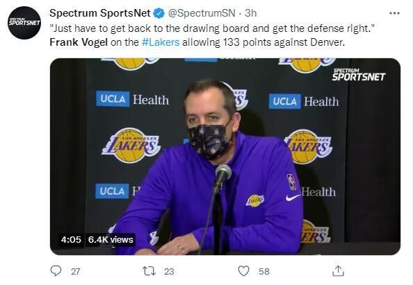 赛后湖人球迷各种喊话沃格尔下课:“我讨论沃格尔,我掌控的资料是可以放弃沃格尔”。