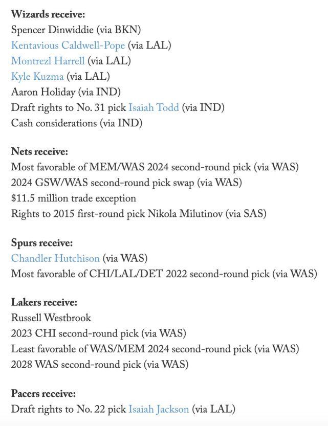 湖人送出库兹马、波普、哈雷尔、2022年首轮22号签得到威少、2023年公牛次轮、2024年奇才/灰熊较差的次轮、2028年奇才次轮签。换言之这笔4换4的交易湖人算是一败涂地了。