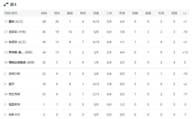 爵士:戈贝尔19分16篮板3盖帽,米切尔13分8篮板7助攻,康利20分,奥尼尔13分,盖伊9分8篮板