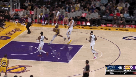 末节,詹姆斯上篮得分,康利三分命中,戈贝尔两罚两中,爵士领先9分。詹姆斯上篮2+1,约翰逊连拿6分,詹姆斯两罚两中,约翰逊上篮再中,湖人打出一波13-0,反超爵士4分。博格达诺维奇上篮得分,约翰逊上篮再中。克拉克森上篮得分,里夫斯补篮得分。戈贝尔上篮得分,詹姆斯两罚一中,布拉德利三分命中。康利两罚一中,威少上篮打成2+1。康利三分命中,最终,湖人主场击败爵士,终结三连败。