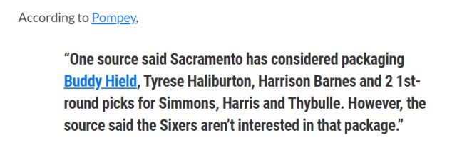 据76人记者Pompey报道,消息源透露,国王曾考虑打包希尔德、哈利伯顿、巴恩斯、两个首轮签去换76人的西蒙斯、哈里斯和塞布尔,但76人方面对这个方案没兴趣。后续记者Amick报道称,国王方面也没兴趣在涉及西蒙斯的交易中得到哈里斯。
