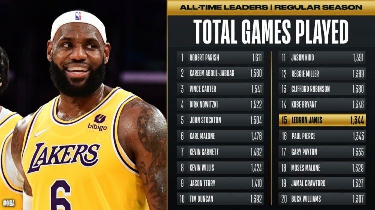 值得一提的是,这是詹姆斯出战的第1344场常规赛。这样一来,詹姆斯常规赛出场数正式升至NBA历史第15位,差2场将追平科比。