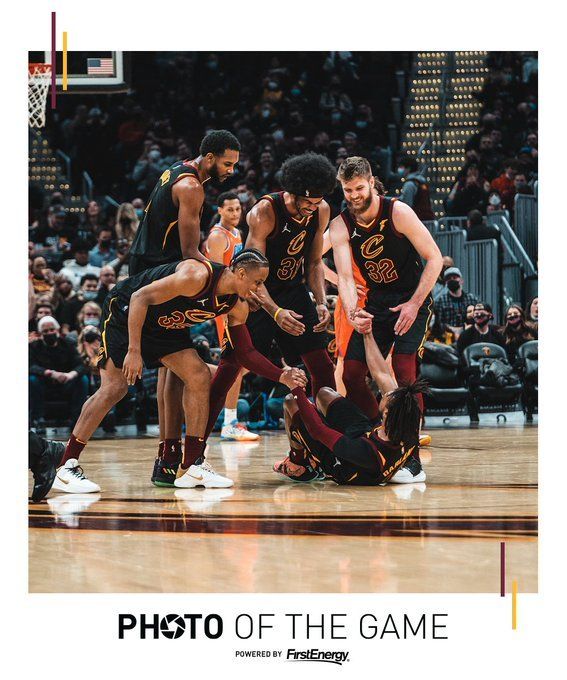 这一幕也被骑士队官方发布在了推特上。一般来说一个球员倒地有一个队友或两个队友就拉起身就行了,但四个人一同去拉就足以说明这位倒地球员在球队中的地位。加兰本赛季是骑士队的第一得分点+助攻点,这支防守球队唯一的持球大核心,他已经成为后詹姆斯时代骑士队最好的球员了吧?