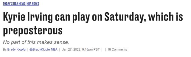记者Brady Klopfer谈到了这个现象,并表示双重标准太荒谬了。一位圈内人士在接受采访时谈到对这件事的看法。“我认为他不应该获得豁免。这个标准应该适用于每个人,就像公交车司机和消防员被告知,除非接种疫苗,否则他们不能上班。然而,你却让篮球运动员根据不同的规则上场,这会让他们在双重标准下变得玩世不恭。如果纽约不让他在主场打球,我不明白旧金山为什么要让他在这里打球。”