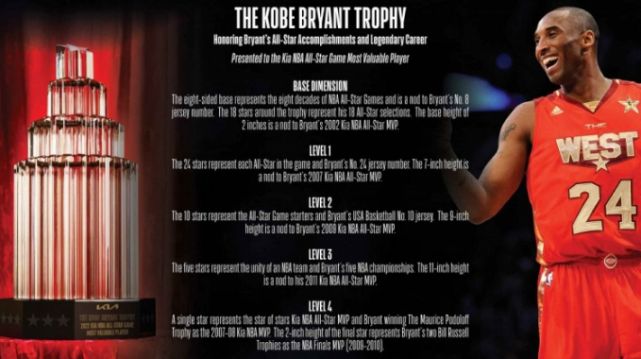 根据NBA官方公布的全明星MVP奖杯设计,其四级设计具有不同的意义,而科比-布莱恩特杯是八边形设计,是致敬科比的8号球衣,而奖杯周围的18颗星是致敬科比18次入选全明星。