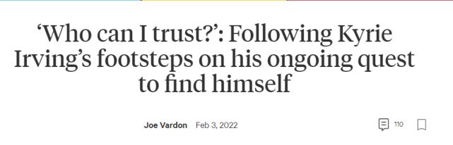 北京时间2月4日,The Athletic名记Joe Vardon撰写长文揭秘欧文,透露了他和詹姆斯关系闹僵的细节,还通过采访解析了欧文的个性。欧文曾在被篮网禁赛期间访问自己的立岩部落,并向一位族人发问:“我可以相信谁?”