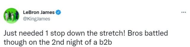 “只差关键时刻的一次成功的防守!兄弟们在背靠背的第二场比赛中战斗到了最后!!”詹姆斯这样写道,显然他是非常遗憾球队功亏一篑。