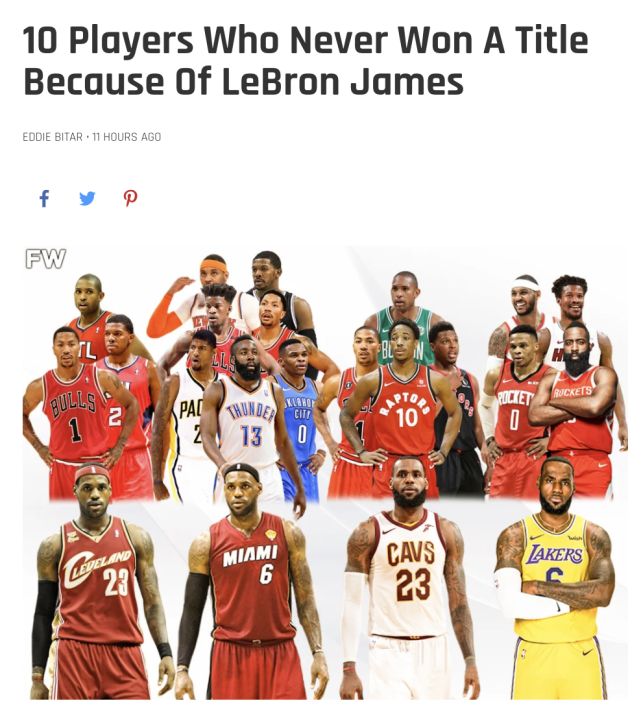 所以回顾勒布朗-詹姆斯的职业生涯,他的存在让不少球星都无法夺下总冠军奖杯。就像迈克尔-乔丹让查尔斯-巴克利、帕特里克-尤因和卡尔-马龙等传奇球员只能终身无冠,而詹姆斯在为骑士、热火和湖人等球队效力期间也阻碍了不少全明星球员无法夺下总冠军奖杯。