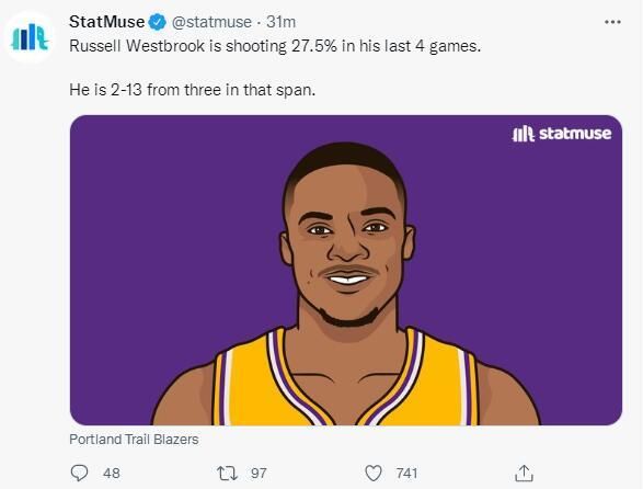 最近的四场比赛威少命中率只有27.5%,三分球为13中2,这也难怪沃格尔弃用他,此役对阵雄鹿他是11中3,三分1中0,得到10分10篮板5助攻4失误1盖帽,命中率27.3%,他的竞技状态是真的很差。