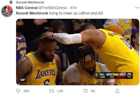 终场前3.3秒湖人已经放弃了比赛,詹姆斯与安东尼-戴维斯在替补席上很沮丧,威少这个末节被弃用了的球星竟然上前安慰老詹与戴维斯。