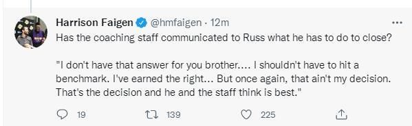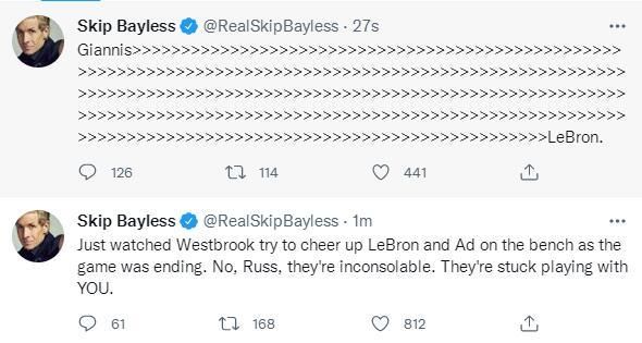 不过‘金牌詹黑’斯利普-贝力斯则嘲讽神龟:在比赛结束后威斯布鲁克站起来安慰板凳席上的安东尼-戴维斯与勒布朗-詹姆斯。不,RUSS,他们伤心欲望,因为他们知道要和你继续一同打球。