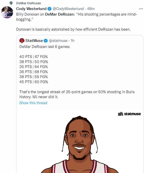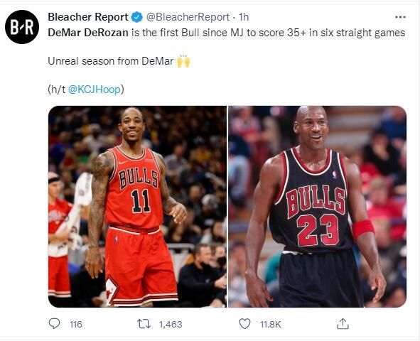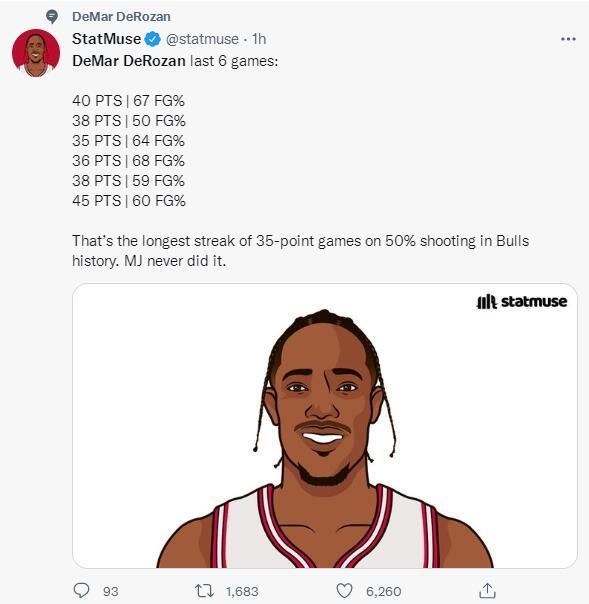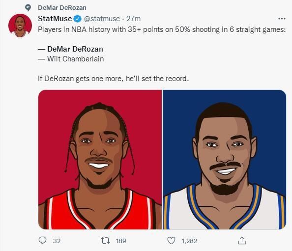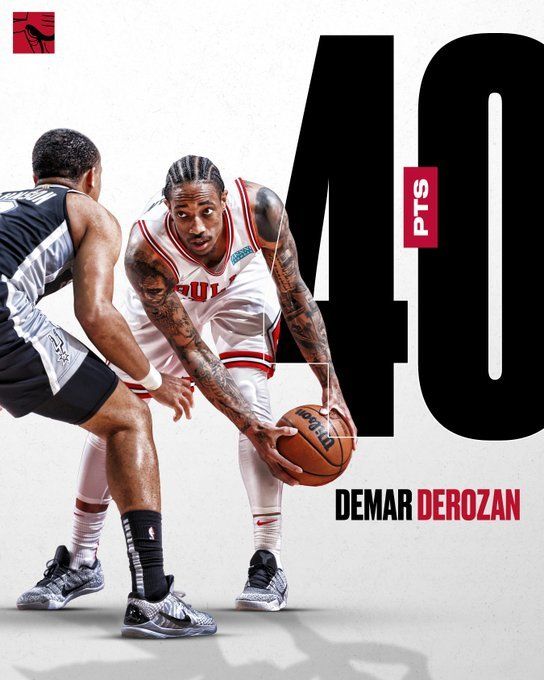 这场比赛后德罗赞也一战创造多项纪录:1.他完成公牛生涯首次连续六场比赛35+;