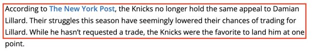 据《纽约邮报》的说法,尼克斯不再是对达米安-利拉德有较大吸引力的球队,他们在本赛季的挣扎表现似乎已经降低他们在未来休赛期推动潜在交易的可能性。