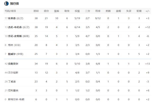 独行侠:东契奇21分10篮板6助攻,布伦森19分6助攻,芬尼-史密斯14分5篮板,贝尔坦斯12分,克勒贝尔19分6篮板5盖帽,丁威迪4分5助攻