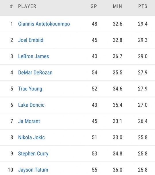 NBA场均得分榜更新:字母哥超恩比德0.1分登顶