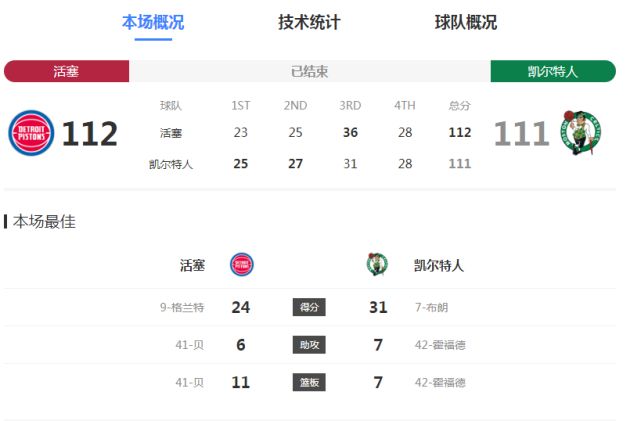 活塞借助坎宁安、格兰特与贝三人得分20+,格兰特命中反超球与坎宁安关键大帽布朗,爆冷险胜凯尔特人终结对手9连胜。