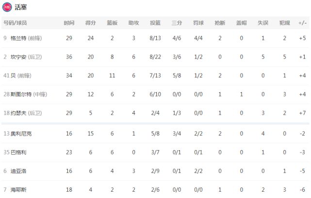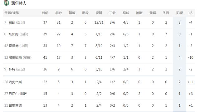 凯尔特人:布朗31分6助攻,塔图姆22分4篮板5助攻7失误,格兰特-威廉姆斯17分,霍福德19分7篮板7助攻,怀特9分6篮板6助攻。