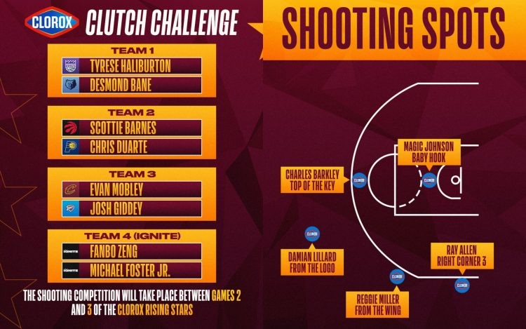NBA全明星关键球挑战赛将会在第三场比赛前进行。为了庆祝NBA75周年致敬历史人物,5个经典投篮位置是以一些历史经典位置为主。