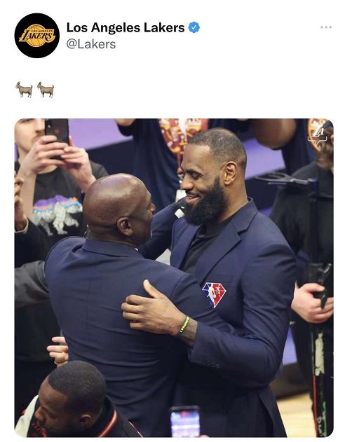 除此之外,湖人官推与公牛官推也是隔空互怼,湖人官推晒出詹姆斯与乔丹拥抱的照片,写道“两个GOAT山羊”。