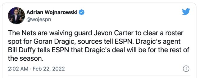 另一方面,据ESPN记者阿德里安-沃纳罗斯基的说法,篮网正式放弃杰文-卡特,以此为签下德拉季奇腾出空间:
