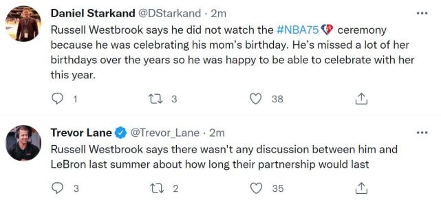 威少入选了NBA的75大巨星,但他并没有前往克利夫兰参加庆典,甚至没有在线观看这场庆典。庆典上,威少在提前录好的视频里向球迷们打招呼。威少表示自己给母亲过了个生日。“多年来,我错过了她的很多生日,所以今年很高兴能和她一起庆祝。”