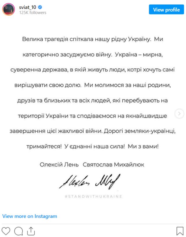 亚历克斯-莱恩,和维亚托斯拉夫-米哈伊柳克的共同声明写道:“我们坚决谴责这场战争。乌克兰是一个和平的主权国家,居住着想要决定自己命运的普通人民,我们为我们的家人、朋友、亲戚和乌克兰境内的所有人民祈祷。”