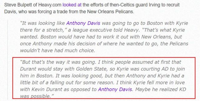 Steve Bulpett采访了一些匿名的高管和消息人士,一位来自鹈鹕的消息人士透露,欧文当时绝对在招募戴维斯。“当时的情况看起来就是戴维斯会去波士顿和欧文一起打一段时间,这就是欧文想要的,”消息源透露,“波士顿和新奥尔良可以讨论这样一笔交易,如果戴维斯决定去哪里,鹈鹕就没什么选择了。”