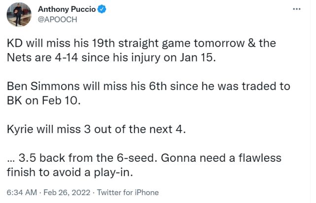 对于篮网来说,要想不打附加赛,他们得尽快调整好状态,多拿下一些胜利了。篮网记者Puccio谈到了球队目前的处境。他在社媒上写道:“杜兰特明天将连续缺席第19场比赛,自从他受伤以来,篮网的战绩是4胜14负。本-西蒙斯自从被交易到篮网后,将连续缺席第6场比赛。欧文未来4场有3场不能出战,篮网要重回东部第6,还差3.5个胜场,他们需要完美地表现才能躲开附加赛了。”