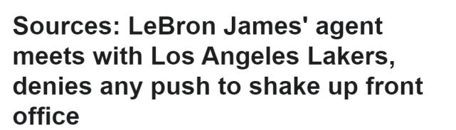 北京时间2月26日,据ESPN记者沃纳罗斯基报道,勒布朗-詹姆斯的经纪人里奇-保罗已经在当地时间本周二与湖人老板珍妮-巴斯以及总经理罗勃-佩林卡完成会面。消息人士透露,富保罗表示,他们没有寻求管理层的变动,他认为球队令人失望的表现是大家共同的责任。