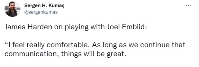 赛后,恩比德谈到搭档哈登的感受时,豪言“不可阻挡”。谈到与恩比德并肩作战,哈登也表示:“我真的感觉很舒服,只要我们继续沟通交流,一切都会变得非常棒!”