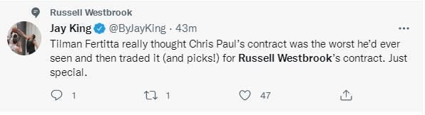 NBA记者杰登-金讽刺威少:费尔蒂塔说克里斯-保罗的合同是他见过最糟糕的合同,然后用选秀权换了威少的合同,但威少的合同现在如此的特别。