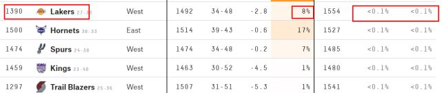 虽然湖人引进两位新援,但他们本赛季的前景依然不被看好。知名数据网站FiveThirtyEight预测他们晋级季后赛的概率只有8%,晋级总决赛和夺冠的概率均低于0.1%。