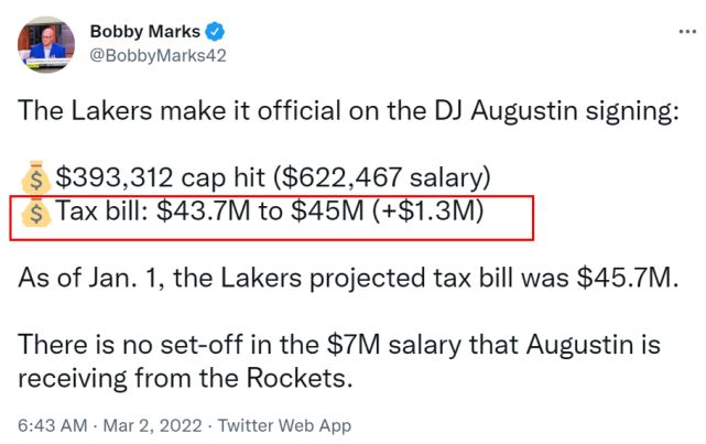 湖人的运作,也给他们的奢侈税账单带来变化。据薪金专家鲍比-马克斯报道,奥古斯丁的工资是622467美元,湖人的奢侈税从原来的4370万美元变成4500万美元,增加了130万美元。