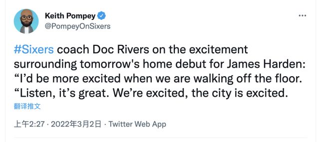 最后需要谈及的是,哈登即将迎来为76人效力的首个主场比赛,而对球迷来说,这肯定会是一场值得关注的比赛。76人主教练道格-里弗斯在谈及詹姆斯-哈登的主场首秀时表示: