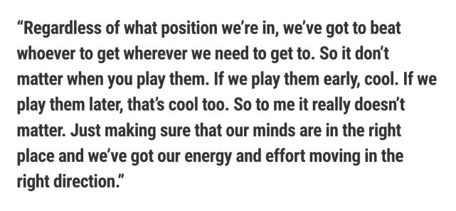 “无论我们身处什么位置,我们都必须击败任何人才能到达到那个位置,所以这并不重要,这对我来说真的无所谓,只要确保我们的方向处于正确位置,并且我们的精力和努力都朝着正确方向前进。”