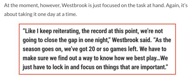 对于目前球队所面临的困境,拉赛尔-威斯布鲁克仍相信球队有能力在最重要的时刻抓住机会。在威少心目中,球队战绩表现只是一个数据,只要湖人能闯入附加赛,威少认为球队就能有季后赛中有所表现: