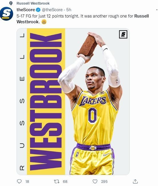 此役被炮轰最多的还是拉塞尔-威斯布鲁克,美媒the Score写道:17中5只得到12分,这对于威斯布鲁克来说又是一个难受的夜晚。