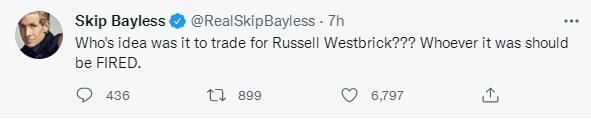 ‘金牌詹黑’斯利普-贝力斯在赛后暗讽詹姆斯:是谁推动拉塞尔-威斯布鲁克的交易的?不管是谁,这个人都应该被解雇。相信大家都知道,交易威少是经过了詹眉的同意,因为佩林卡拒绝给德罗赞三年合同,威少与希尔德二选一,詹眉只好选了威少。