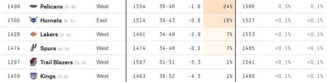 而湖人进入季后赛的概率只剩下7%,湖人进入季后赛的概率跟马刺7%是一样的,FTE明显更看好后续赛程更容易的鹈鹕,鹈鹕进入季后赛的概率有24%,所以就算湖人能打附加赛进入季后赛也很难,威少的自信没有什么用处。
